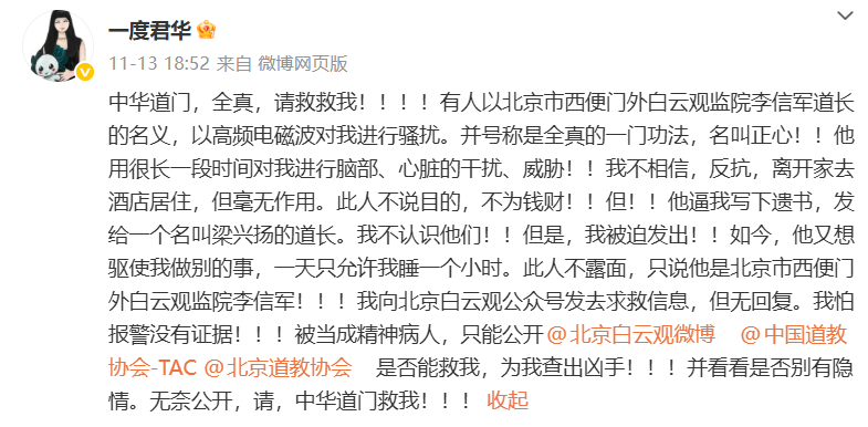 13日,《星落凝成糖》作者@一度君华 发文求救,称有人以高频电磁波对她进行骚扰,逼她写下遗书,一天只允许睡一小时。