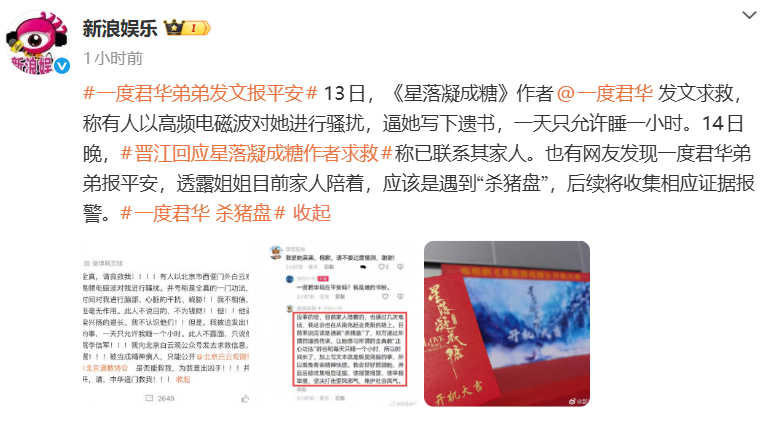 据新浪娱乐,自称是一度君华弟弟的网友报平安,透露姐姐目前家人陪着,应该是遇到“杀猪盘”,后续将收集相应证据报警。